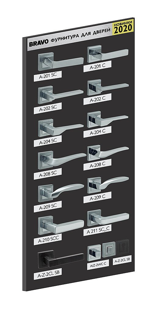 Описание: Стенд с фурнитурой Браво - компактная конструкция на которой представлено 13 моделей дверных ручек серии 200, фиксатор и накладка той же серии. Стенд поставляется в правом и левом исполнении.