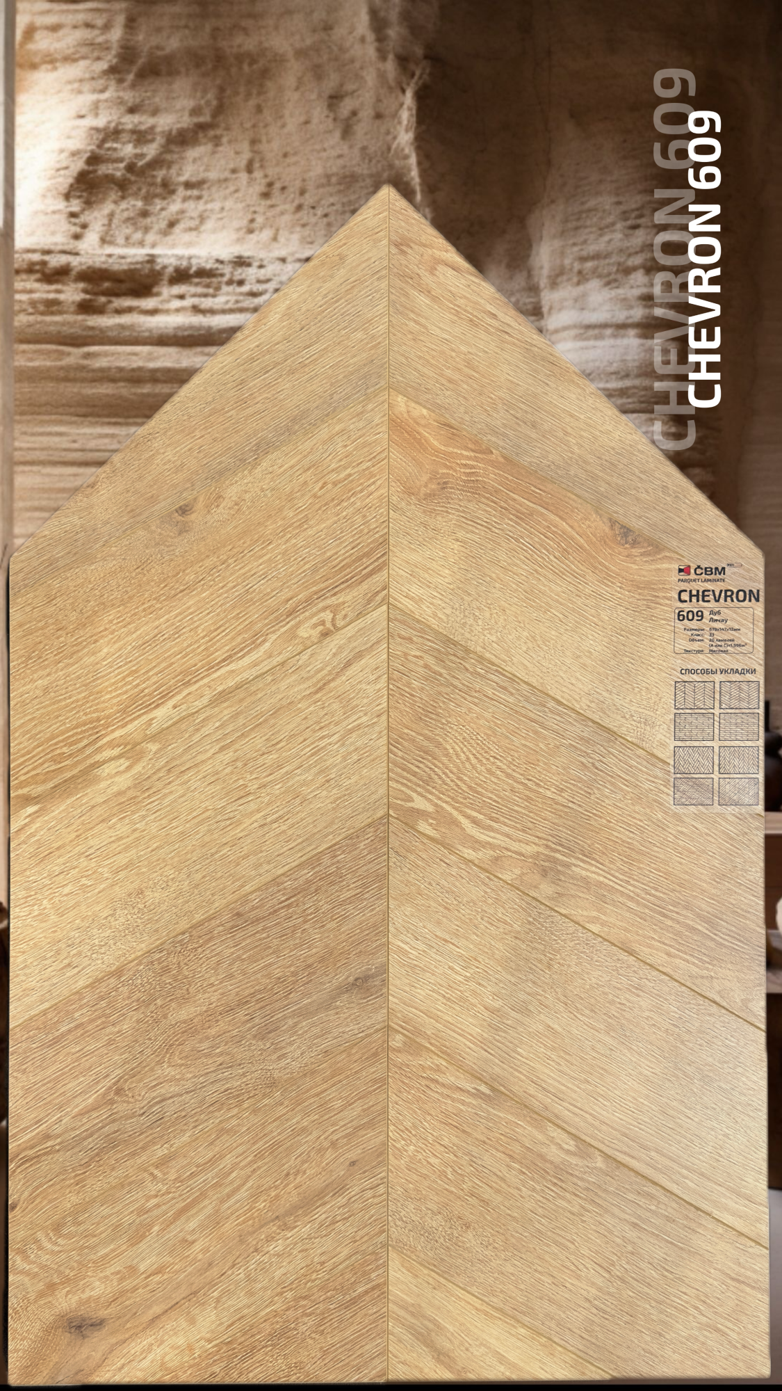 Страна производства Чехия Коллекция Chevron Класс пожарной опасности КМ 3 Производители ламината Cbm Класс ламината 33 Толщина доски ламината 12 мм Размеры доски ламината 679х147 мм Вид\Имитация материала Ёлочка Упаковка ламината 1,996 м2, досок (20 шт одной стороны (А или С), 19 кг. Наличие фаски ламината 4х-сторонняя Влагостойкость ламината Повышенная Срок эксплуатации ламината (в домашних условиях) 25 лет -
