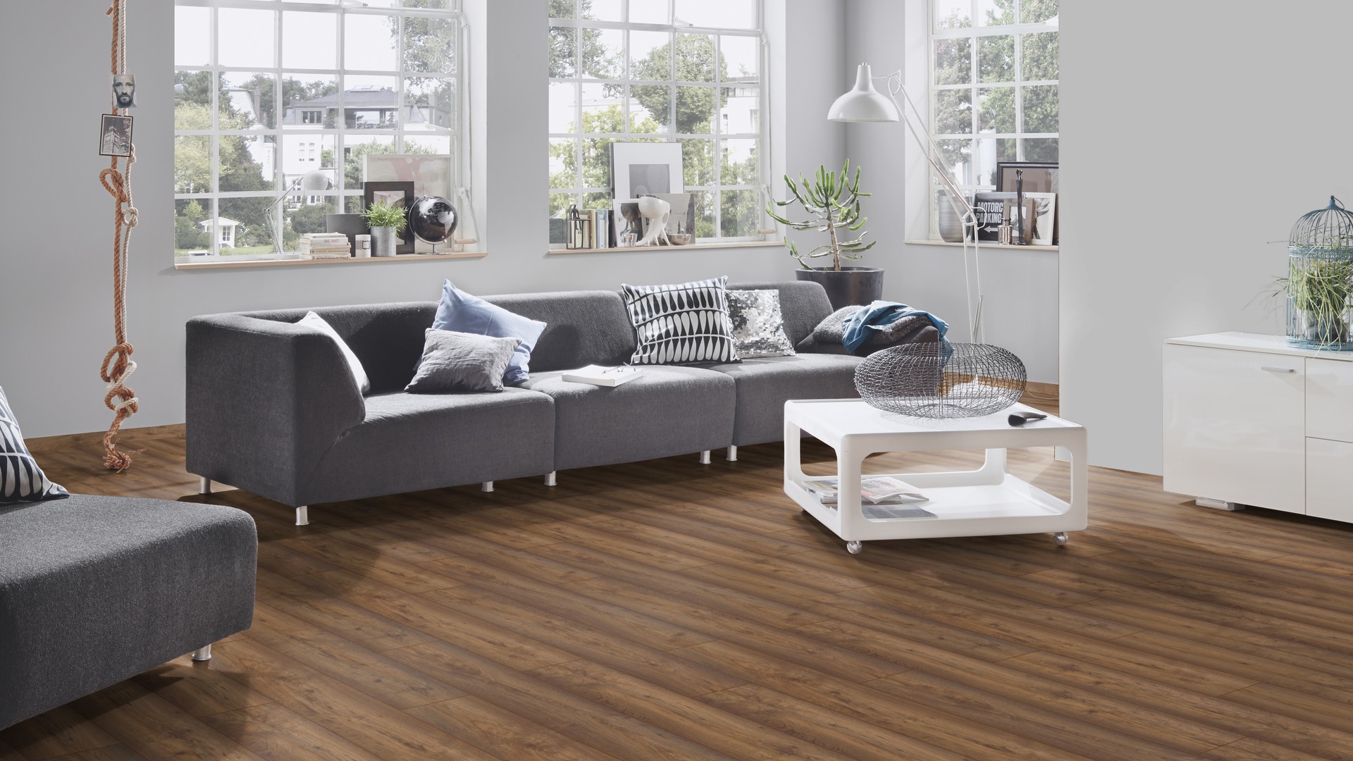 Коричневый цвет и однополосный рисунок ламината имитируют натуральную текстуру дерева.